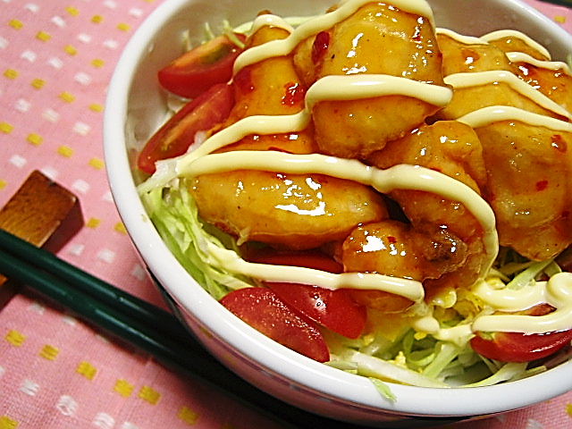 白米の上にキャベツの千切り、プチトマト、炒り卵、鶏チリ、マヨが乗ってます。