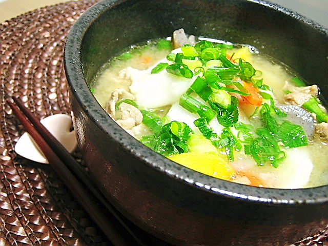 豚汁にだんごの粉で作った平たい楕円形のだんごを入れただけです。