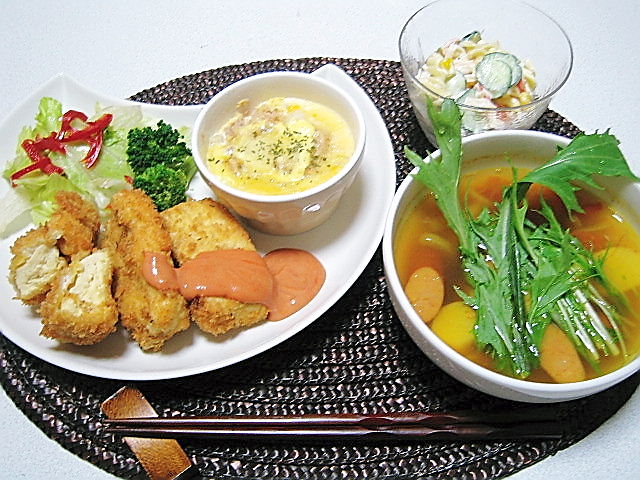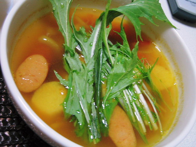 コンソメを投入したスープに乱切りした長芋、タマネギ、ウィンナを入れて、火が通ったらトマトの角切りとカレー粉を投入。器に盛って、飾りに水菜を乗せました。