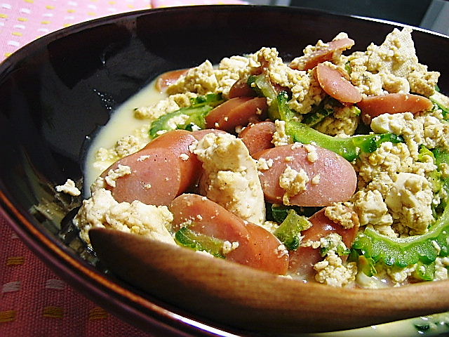 昨日は朝からお茶しか飲んでいなかったのでものすっごくお腹が空いていて、少しでも早くご飯にしたかったので、豆腐の水切りをせずにゴーヤチャンプルーを作ってしまったんです。だから水っぽいんですヨ……
