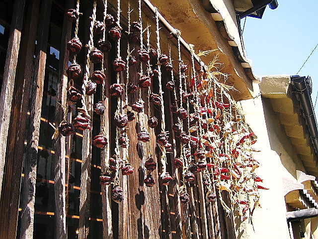 これは軒先に何気なく下がっていた干し柿と唐辛子。こういう昔風なものがちらほらと見られます。