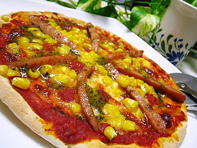 ピザはトマトソースとチーズしかトッピングがなかったので、あとでウィンナーとコーンをのせてみました。ボリュームがUPしてウマシ!ですよ~。