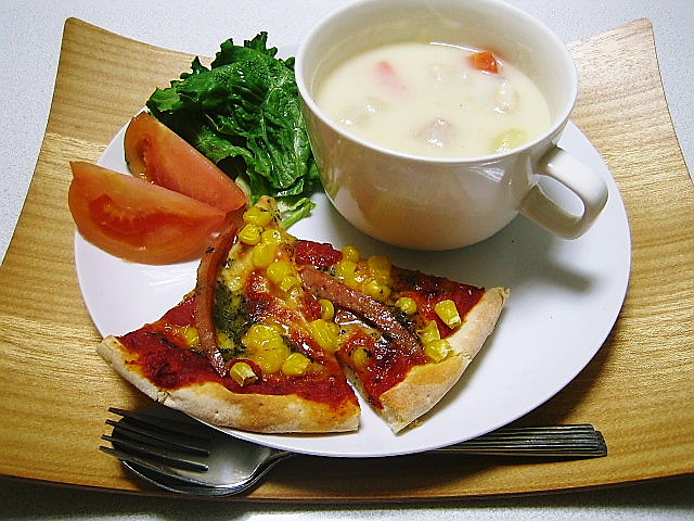 ≪3/2 晩ご飯メニュー≫・市販ピザ(+ウィンナ、コーン)