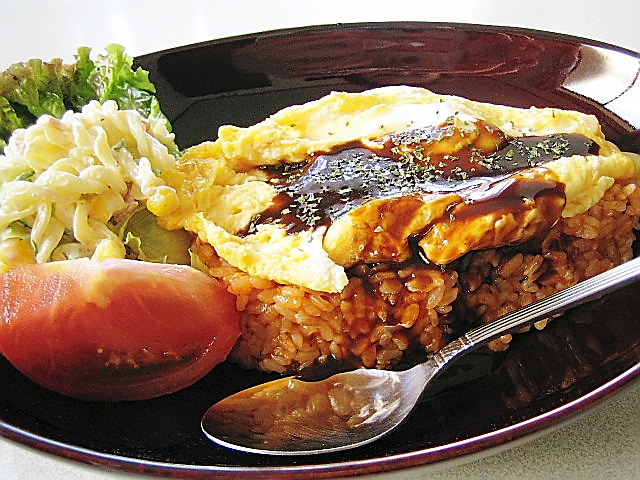 ミートソースとお米を鍋で温めて混ぜただけのケチャップライスに、チーズ入りのオムレツを乗せただけ。