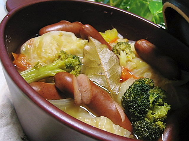 野菜は冷蔵庫にあるモノで。ウィンナの代わりに鶏肉や、油を落とした豚バラのブロックなどを入れても美味しいと思います(^ー^)