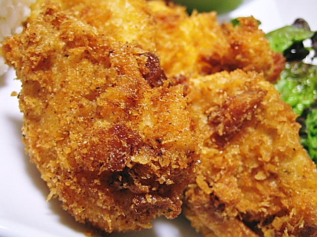 今回は揚げ衣のパン粉の中に、冷凍していたパンの耳を細かく刻んだものを加えています。そのお陰で、衣の1度付けでもサクサクになりました♪
