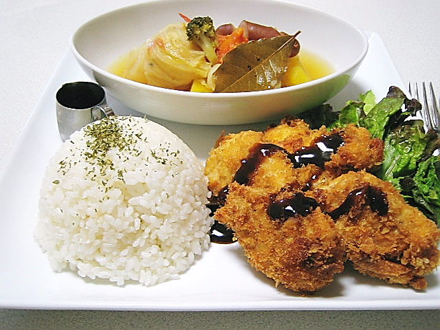 ③揚げ衣を小麦粉→玉子→パン粉の順につけ、たっぷりの油でこんがりきつね色になるまで揚げたら出来上がり。お好みのソースをかけて召し上がって下さい。