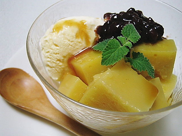 といってもたいしたモノではなく、昨日買ったサツマイモ豆腐、あずき、アイスでパフェを作っただけですが(^-^;)