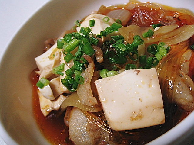 ③一口大に切った豆腐と春雨を入れ、落とし蓋をして煮込み、春雨に味が染み込めばOK。器に盛って、青ネギなど青みのものを散らせば完成です。