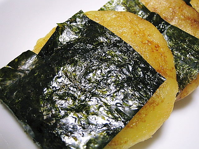 ④バターを耐熱容器に入れて、レンジに20秒ほどかけて溶かし、そこに醤油を混ぜてタレを作る。それを焼きたての③に塗り、お好みで海苔を巻いて出来上がりデス。