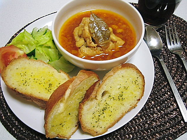 ◆ガーリックトーストと鶏肉のトマト風味スープ◆